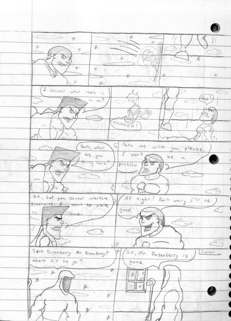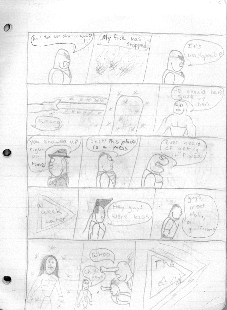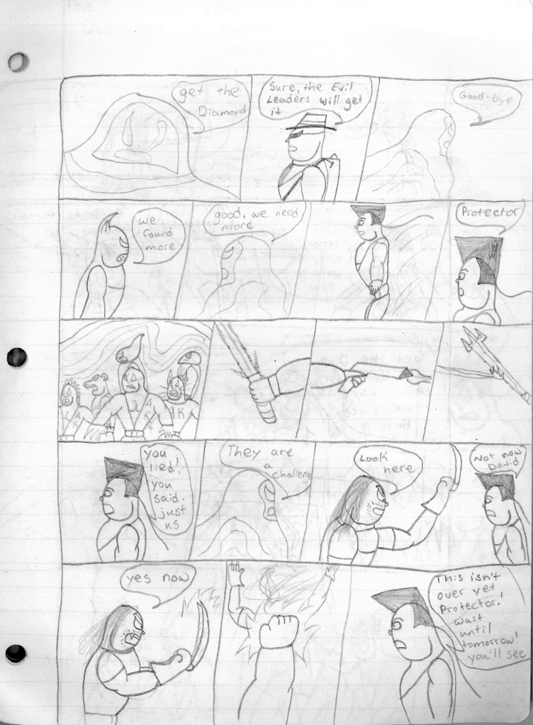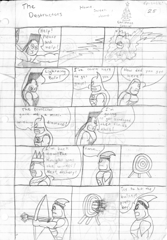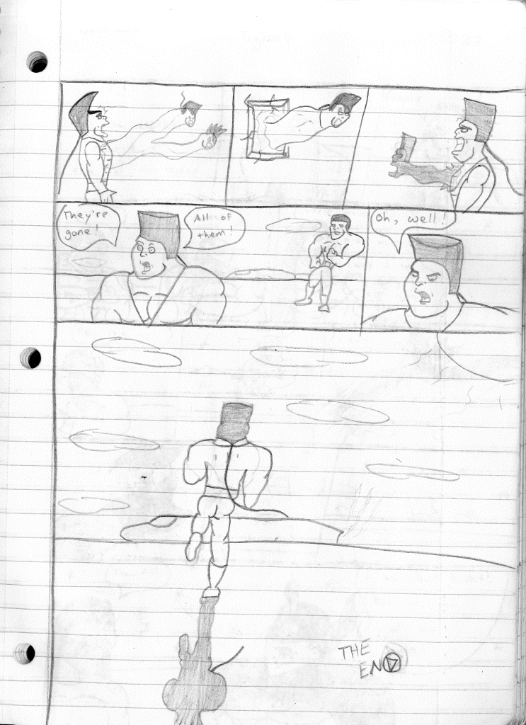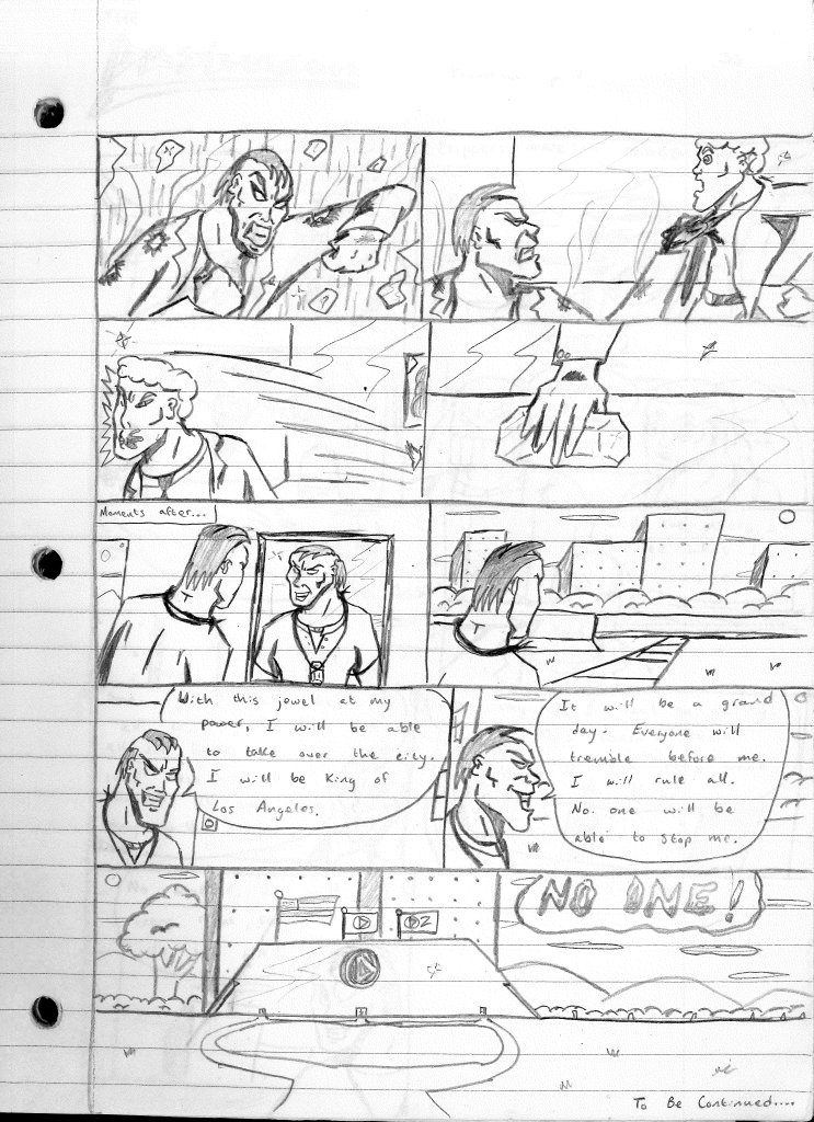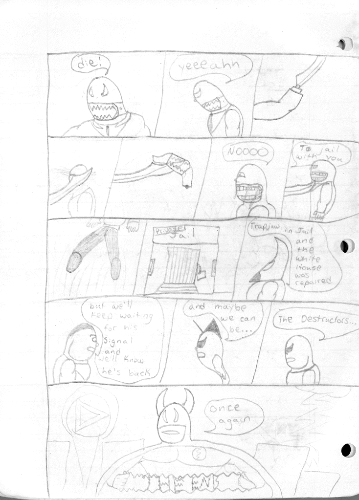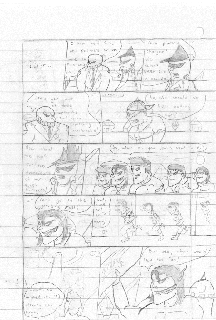 This was the last Destructors story that I wrote to completion. Which is really sad that I ended it on a cliffhanger. Furthermore, this episode showcases the growth I was having as a writer since the Destructors did not show up once. I say this showcases growth, because I’m focused on getting to know our villain. If you go back to the previous episode, it was page five before Lightning Bolt and his gang show up to investigate. I feel like this story should not have been split into two parts since I was basically working up to the same amount of story pages, if not less. But for dramatic purposes (and probably a lack of ideas), I ended this episode here.