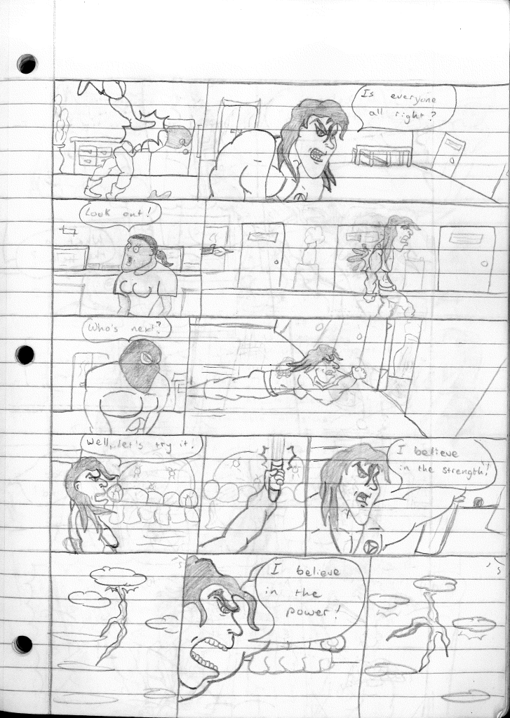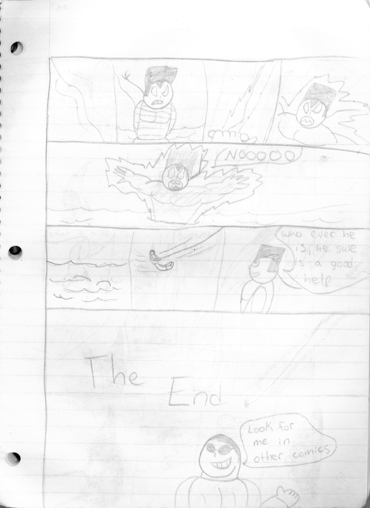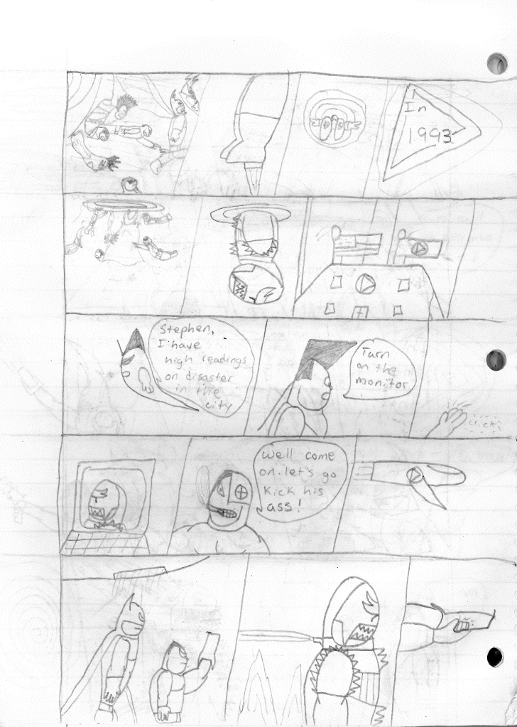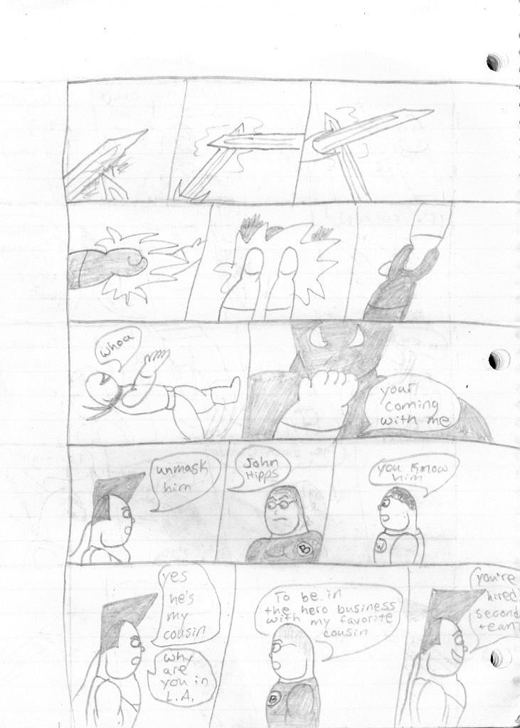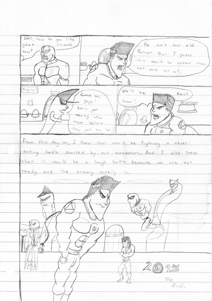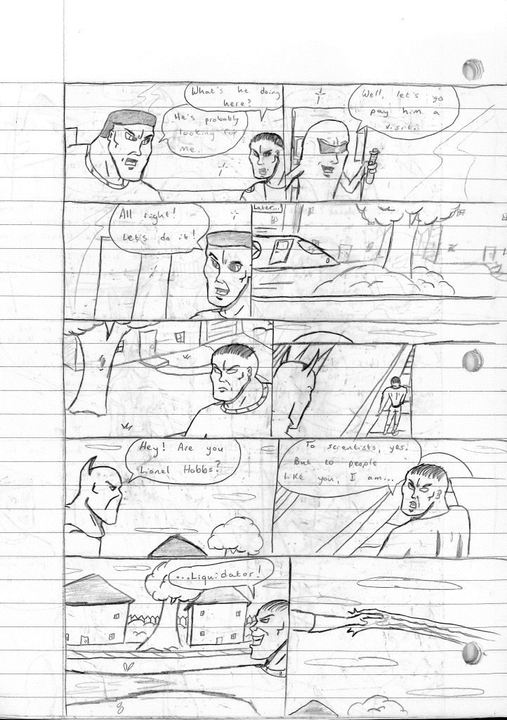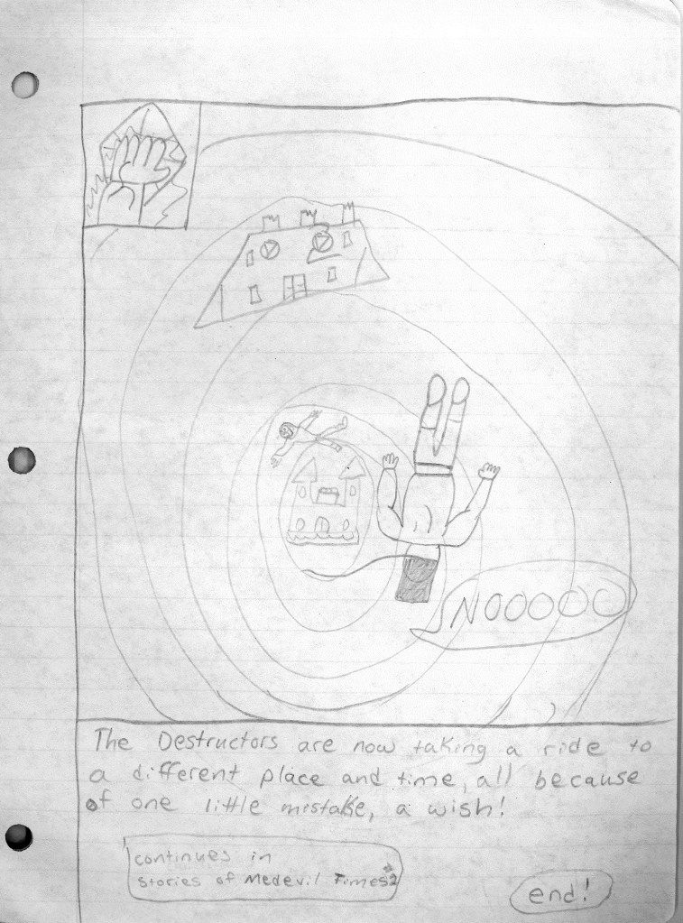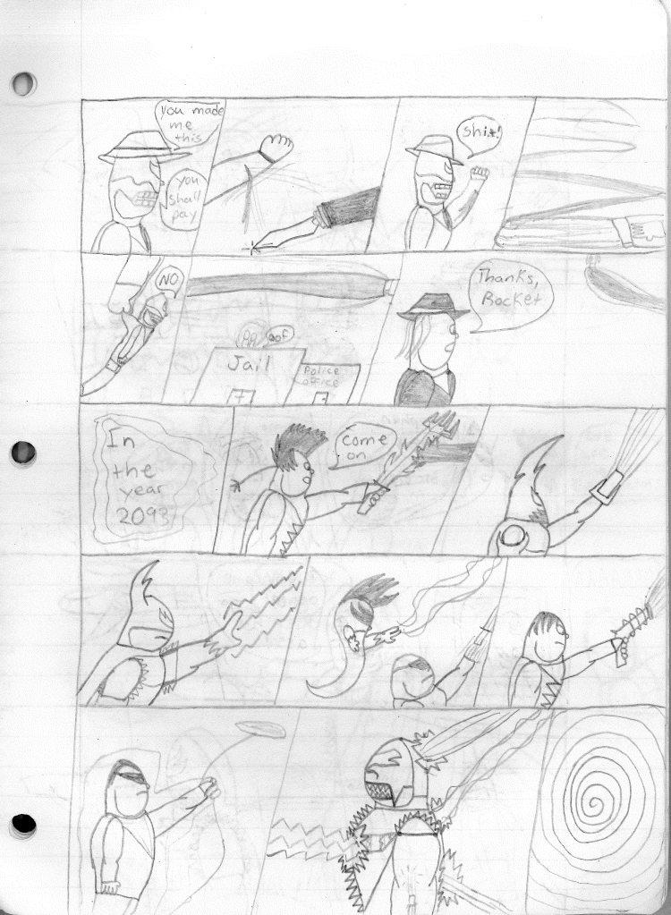 This was the last Destructors story that I wrote to completion. Which is really sad that I ended it on a cliffhanger. Furthermore, this episode showcases the growth I was having as a writer since the Destructors did not show up once. I say this showcases growth, because I’m focused on getting to know our villain. If you go back to the previous episode, it was page five before Lightning Bolt and his gang show up to investigate. I feel like this story should not have been split into two parts since I was basically working up to the same amount of story pages, if not less. But for dramatic purposes (and probably a lack of ideas), I ended this episode here.