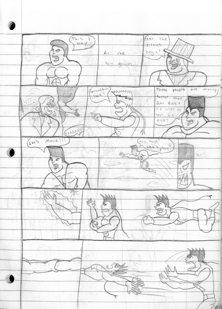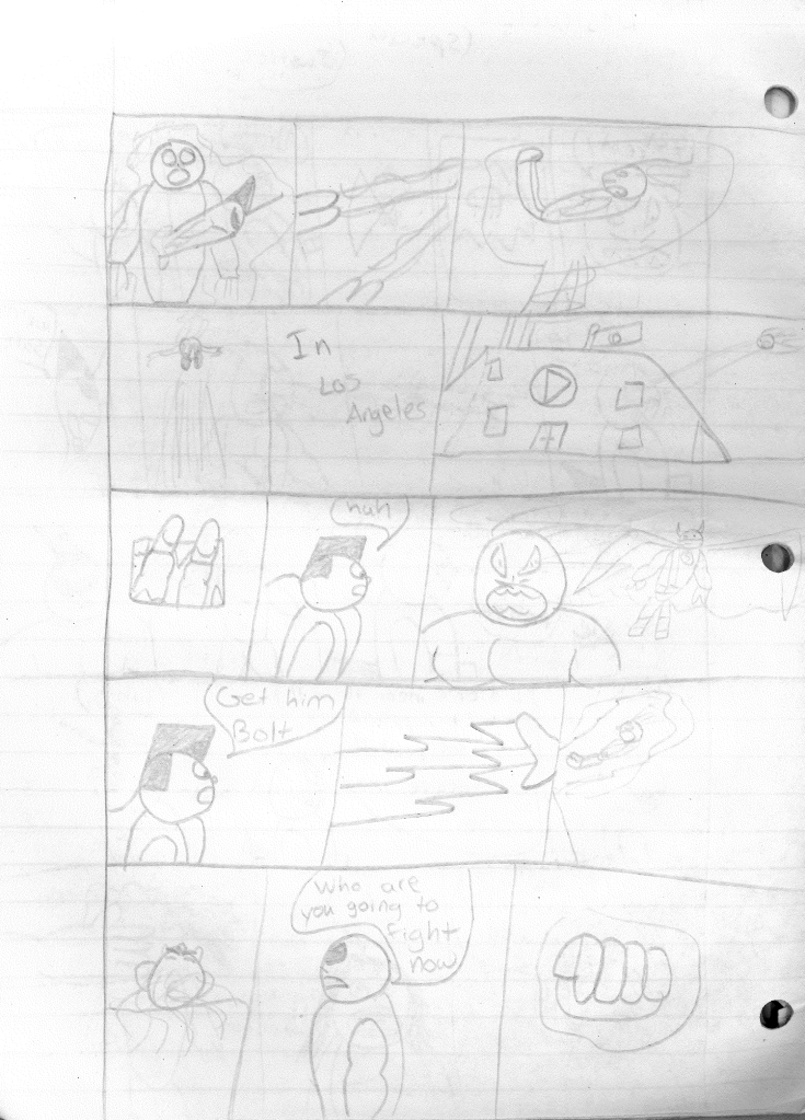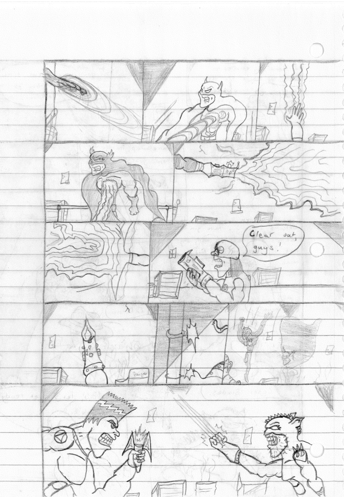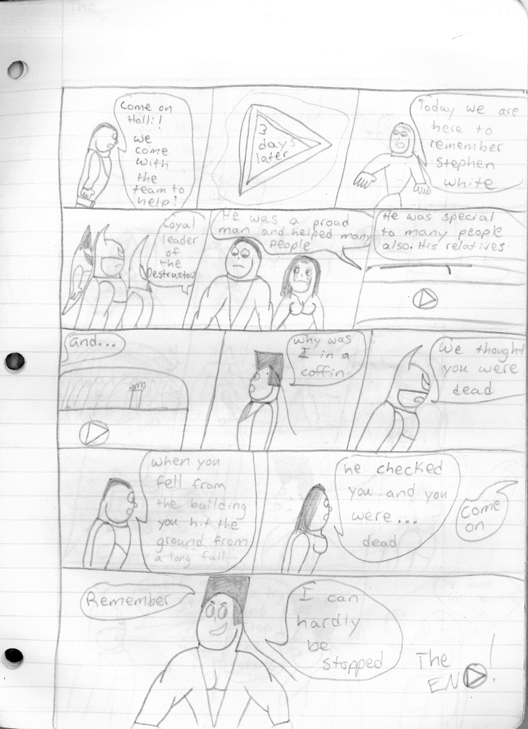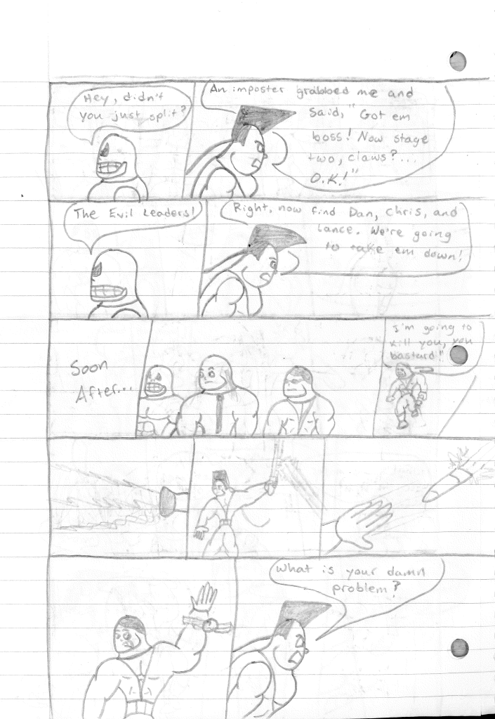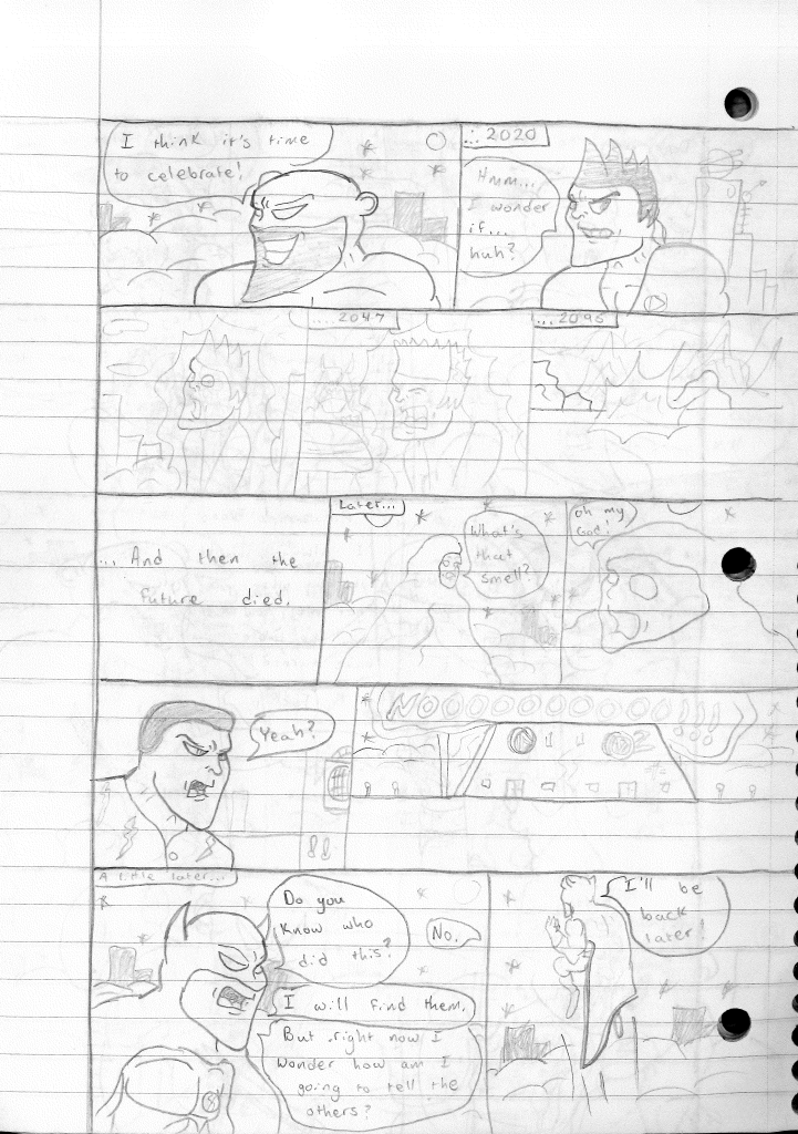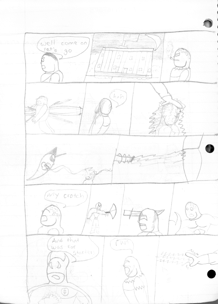 This was the last Destructors story that I wrote to completion. Which is really sad that I ended it on a cliffhanger. Furthermore, this episode showcases the growth I was having as a writer since the Destructors did not show up once. I say this showcases growth, because I’m focused on getting to know our villain. If you go back to the previous episode, it was page five before Lightning Bolt and his gang show up to investigate. I feel like this story should not have been split into two parts since I was basically working up to the same amount of story pages, if not less. But for dramatic purposes (and probably a lack of ideas), I ended this episode here.