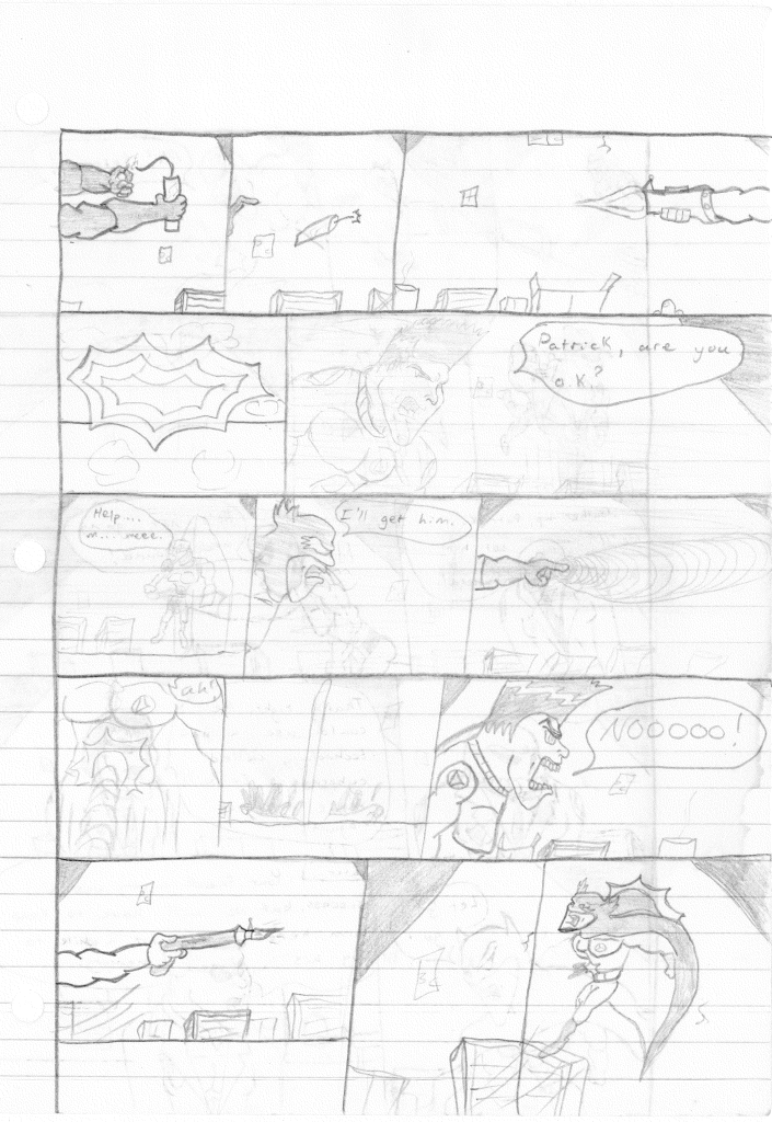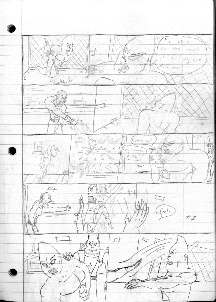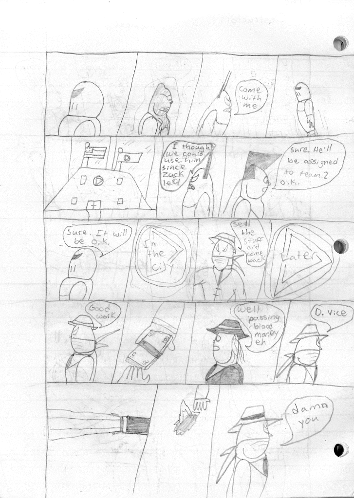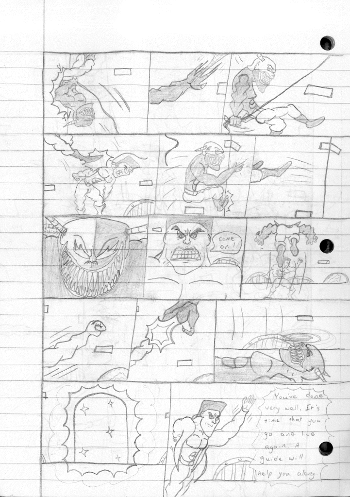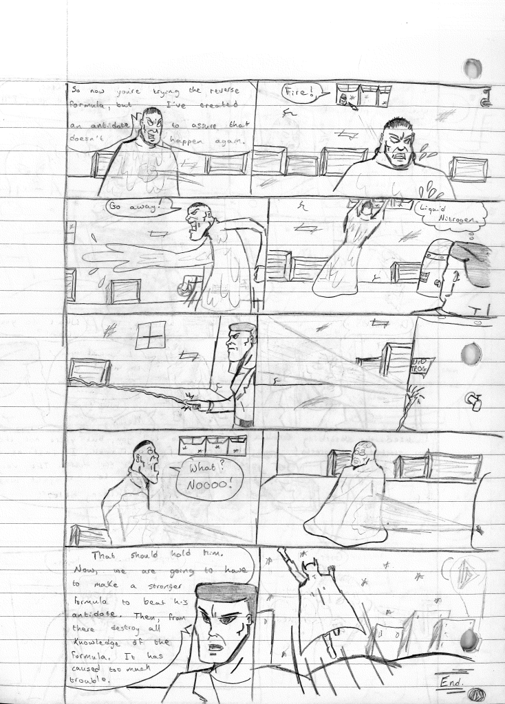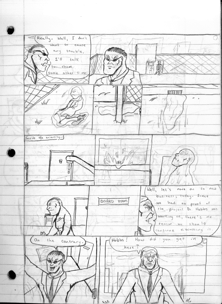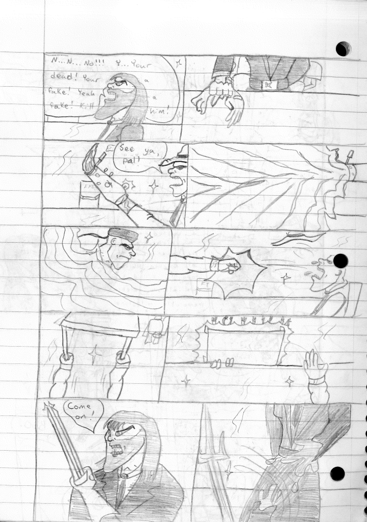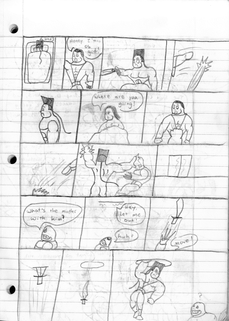 This was the last Destructors story that I wrote to completion. Which is really sad that I ended it on a cliffhanger. Furthermore, this episode showcases the growth I was having as a writer since the Destructors did not show up once. I say this showcases growth, because I’m focused on getting to know our villain. If you go back to the previous episode, it was page five before Lightning Bolt and his gang show up to investigate. I feel like this story should not have been split into two parts since I was basically working up to the same amount of story pages, if not less. But for dramatic purposes (and probably a lack of ideas), I ended this episode here.