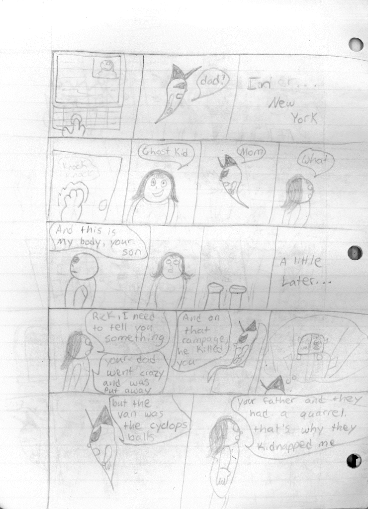 Picking up from where we left off, Ricky’s father is about to assault Mary when Ricky’s corpse bursts through the front door and throws a blade at him. The Ghost Kid follows up with a phantom beam to the face. For some reason, they believe they are safe, but are quickly proven wrong. Ricky’s father then asks the Ghost Kid to be his son one more time, as if he isn’t still his son in some capacity. So, the Ghost Kid possessed the corpse and transforms into some human Ghost Kid (?). The abusive father then attempts to apologize for killing his son and begs for forgiveness. Why Ricky questions why, his father says to be a family again, a notion which Mary rejects. Ricky’s father backhands Mary, causing the Ghost Kid to break his possession of the corpse. The Ghost Kid blasts his father with a phantom beam so intense, he is launched into the air and thrown all the way to the Destructors HQ in Los Angeles. Stephen orders Lightning Bolt to get him. So, Lightning Bolt hits Ricky’s father with a lightning bolt so intense it launches him all the way back to Mary’s home in New York. The corpse taunts his father, which leads to him punching the corpse and somehow the Ghost Kid. Ricky’s father attempts to speak to Mary, but the corpse intervenes and begins punching his father. Ricky’s father then licks blood off of Mary’s face (??) which enrages the Ghost Kid, so he hits him with a less intense phantom beam which does nothing but set us up for the final showdown. TO BE CONTINUED…