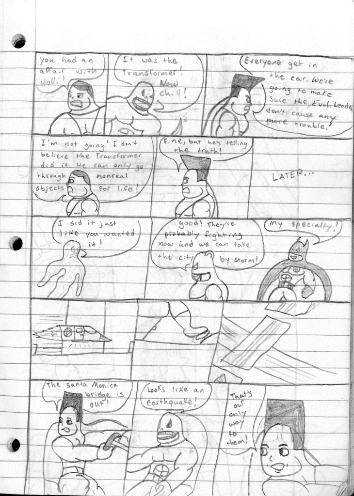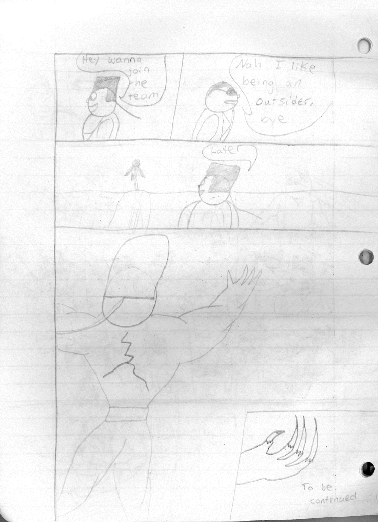 While I don’t remember every little detail, I can recall planning this story as if it was meant to be a big event. And from the beginning, it seems like that was the purpose. I showed almost every single character I had introduced up to this point. And yet most were nothing more than cameos. Hell, I technically introduced a character in this episode. The aforementioned character, Transformer, was another one of these characters that I half developed. His ability was being able to possess and control inanimate objects. Could be fun to explore if I chose to.