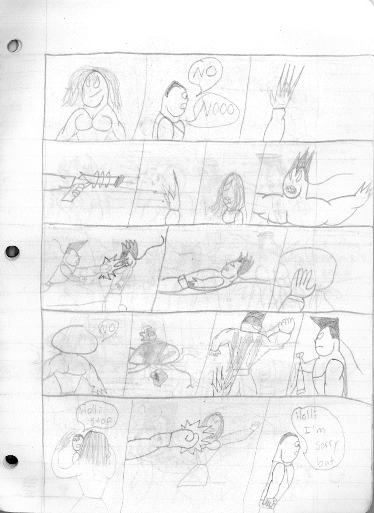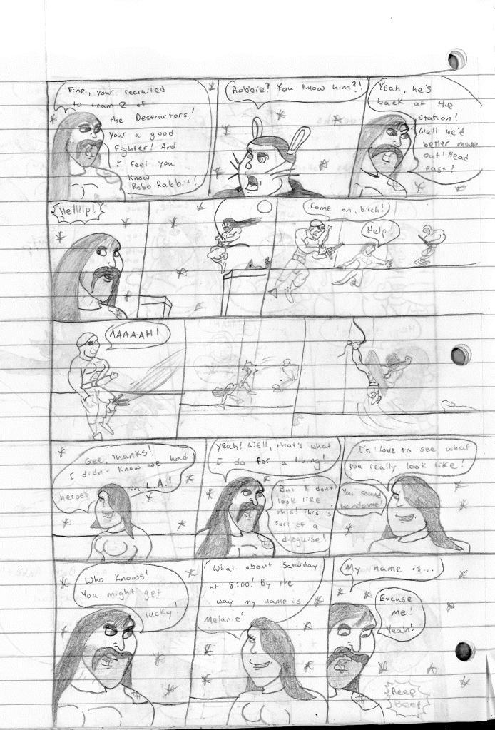The conceit of this two-part story was, on one hand, to separate the teams and allow the Destructors 2 a chance to shine. The other was to introduce Holli. Up to this point, I typically avoided drawing women for the same reason I didn’t draw people of color: I was bad at it. I tried my absolute best to make Holli look moderately attractive, but ultimately had to use cartoonish bulging eyes to get my point across. I feel like it had been brought to my attention that there were no women in my comics. Granted, there WERE women here and there, but never much beyond a damsel in distress. While I won’t say Holli was never used in such a way, her presence opened the door for additional female heroes to appear in the future.
