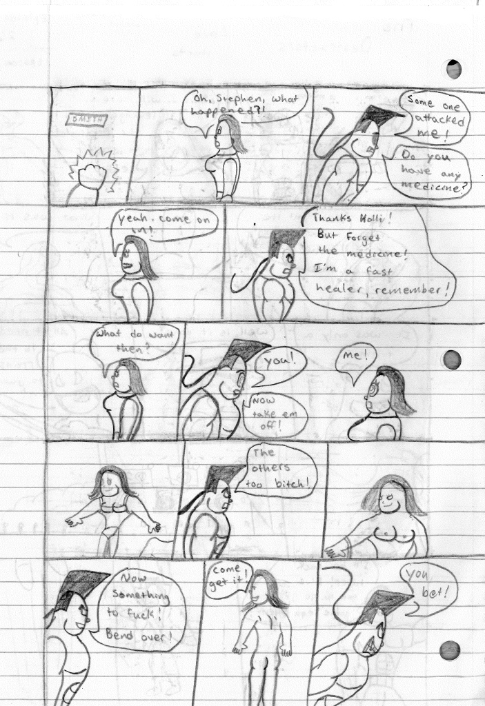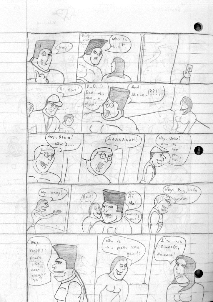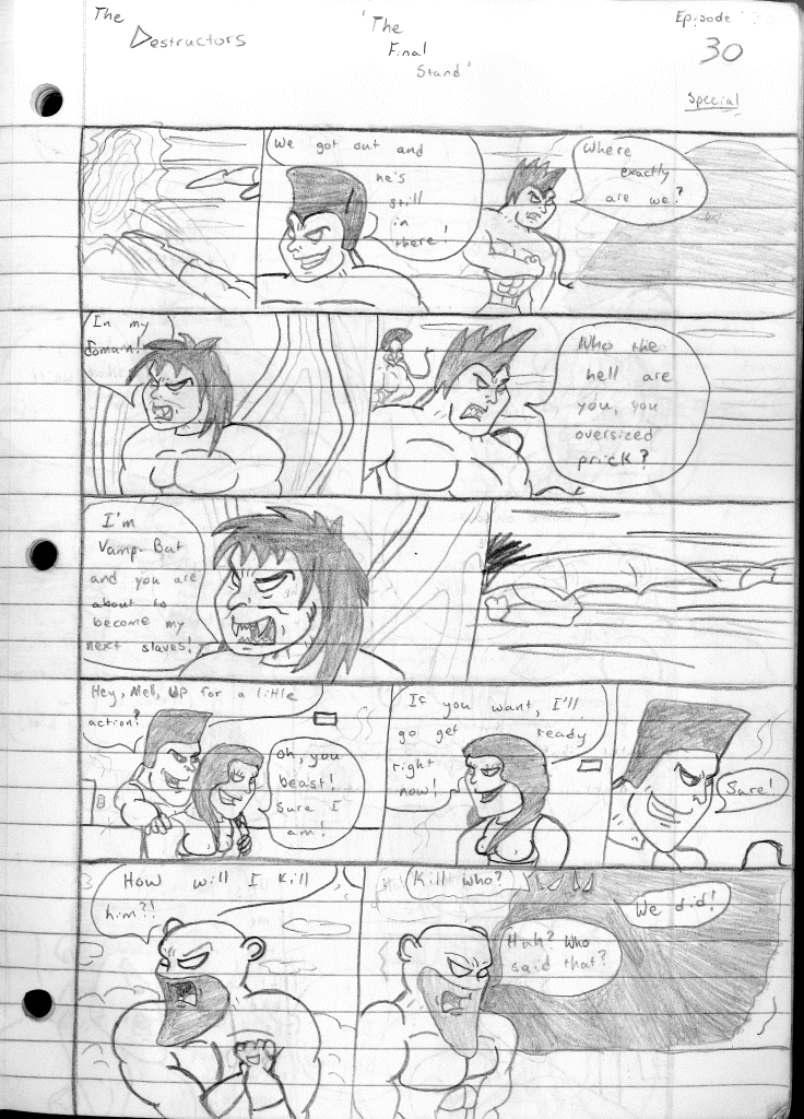 I believe that I stepped away from writing The Destructors between episode #29 and episode #30. For what reason, I am unsure but I feel confident in saying that based on the drastic change in quality between the two. While I hadn’t perfected the style, it was definitely more refined. It still needed some tightening, especially looking at everyone’s chin. It’s like a Jay Leno convention. The eyes also needed some work. Melanie is the most improved design though.