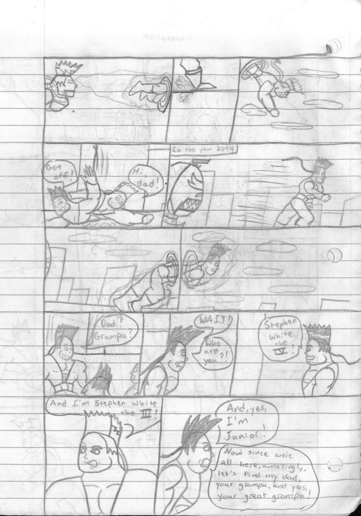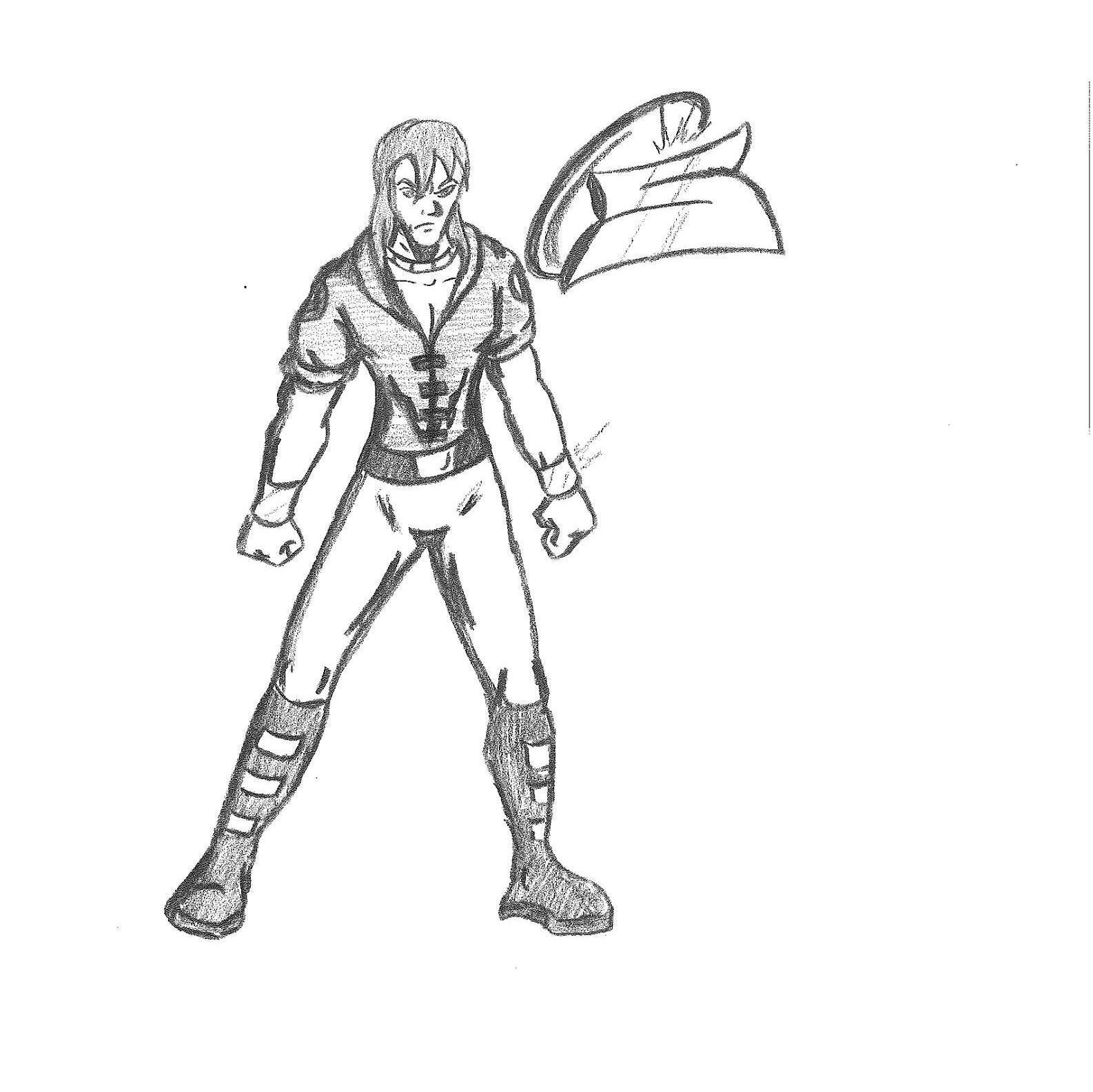 And while we’re on the subject of Super “S”, I guess I want to discuss his design. I don’t think I’ve attempted to draw Super “S” in over a decade, maybe closer to two. The reason I feel confident in saying that is because I know that I’ve sketched almost everyone of my characters in some modern form, but not this one. The conceit was attempting to meld together two designs, which was the white long-sleeve look and the red jacket look. You probably weren’t aware the jackets were red. Funny enough though, I pretty confident in saying that Stephen’s jacket was initially orange in the beginning. Not sure why I changed that. Anyway, look at the design and you’ll see what I was attempting to do. The hair is the thing that bothers me most. I wasn’t quite sure how to give the hair an extra dimension. So, it often times looks like Stephen is wearing a coonskin cap. This is probably why I changed his normal everyday hair to just be long.