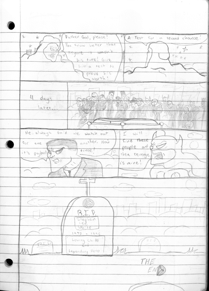 A few years before I wrote this story, the death of Superman was a massive comic book event that actually garnered legitimate news coverage. I remembered being fascinated by the whole thing, much like many others were at the time. Now, it’s looked back on as this cheap marketing gimmick. But you can’t argue with the results. I had emulated some elements in an episode of Lightning Bolt and the Ghost Kid where Lightning Bolt supposedly dies. When I had a similar idea for Stephen, I didn’t want to repeat what I had done initially which was fake his death. Stephen was dead and had to find his way back to life. Coincidentally, I recall having a copy of The Adventures of Superman #500, and in the story Jonathan Kent and Superman are in the afterlife together. I don’t recall any of the specifics from that story. I just remember liking the idea of a limbo. So, I turned it into a waiting area of sorts. Limbo is where you go after death to learn where your soul goes. Seemed good to me.