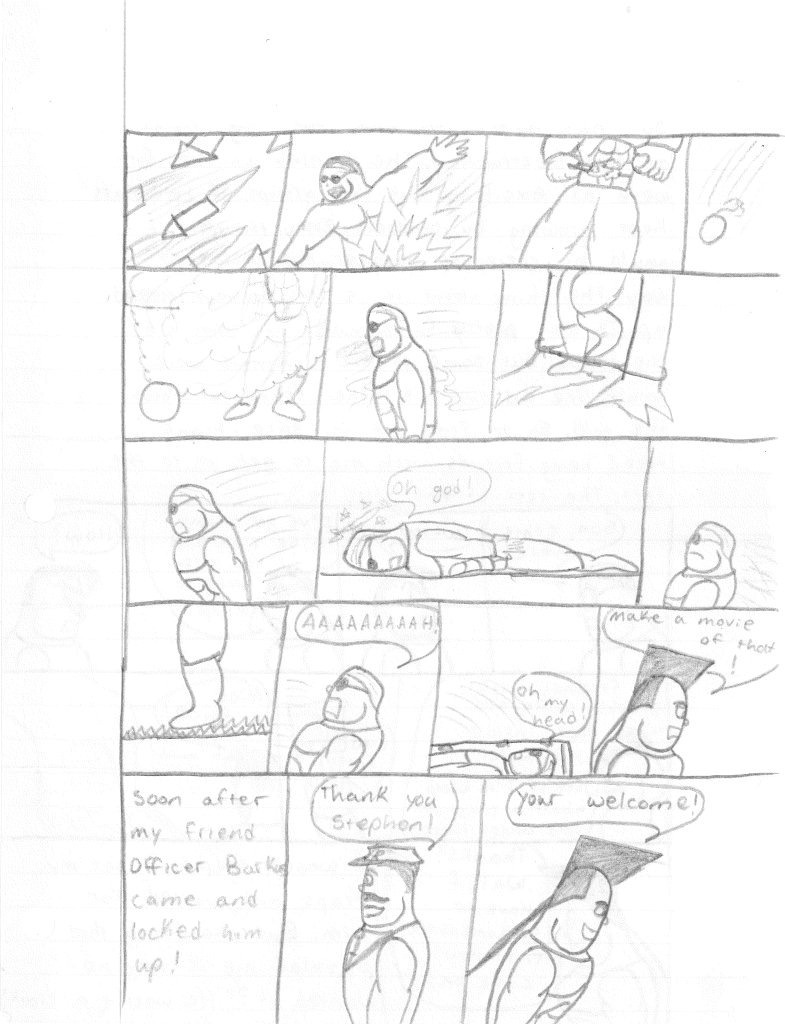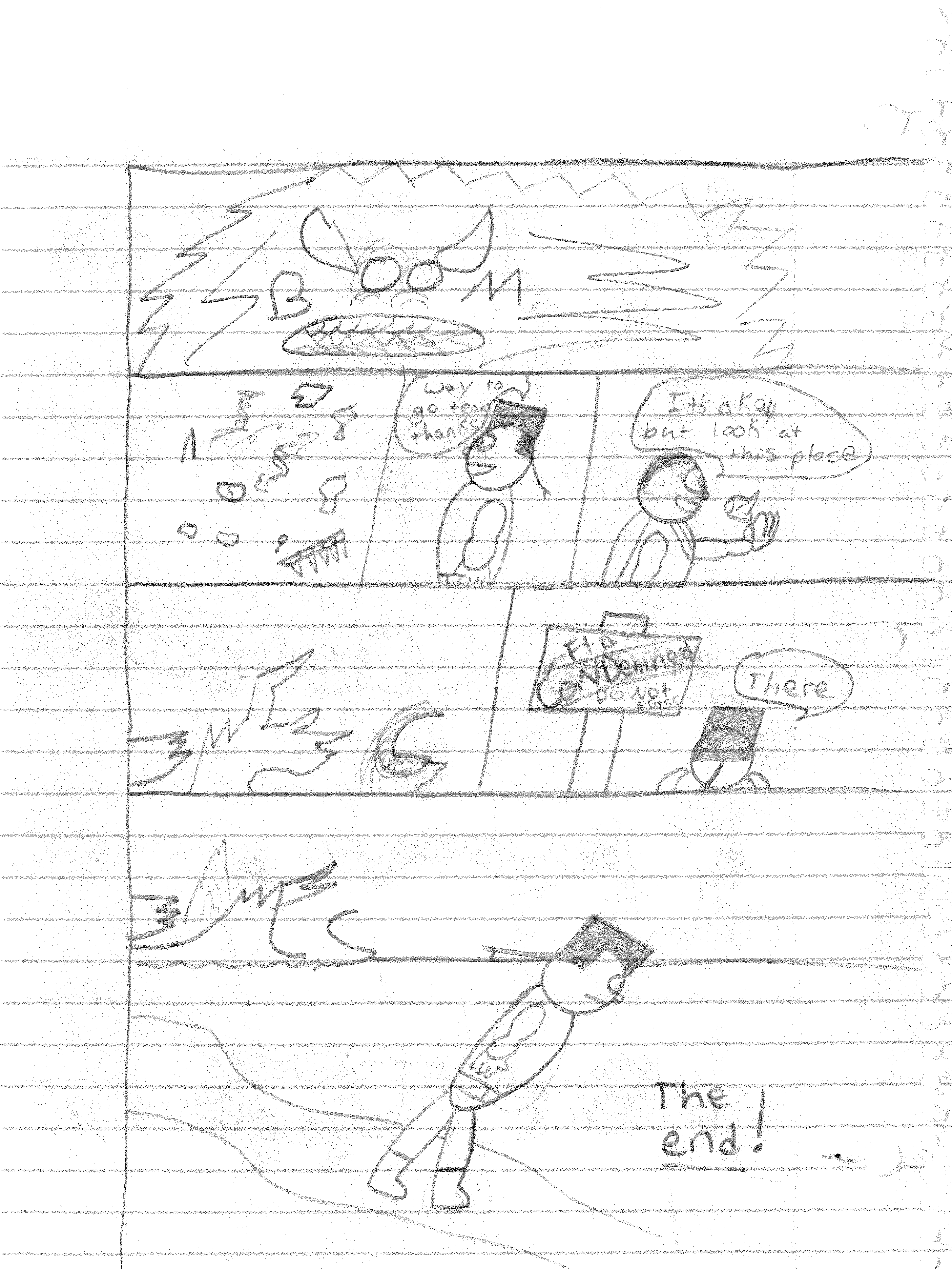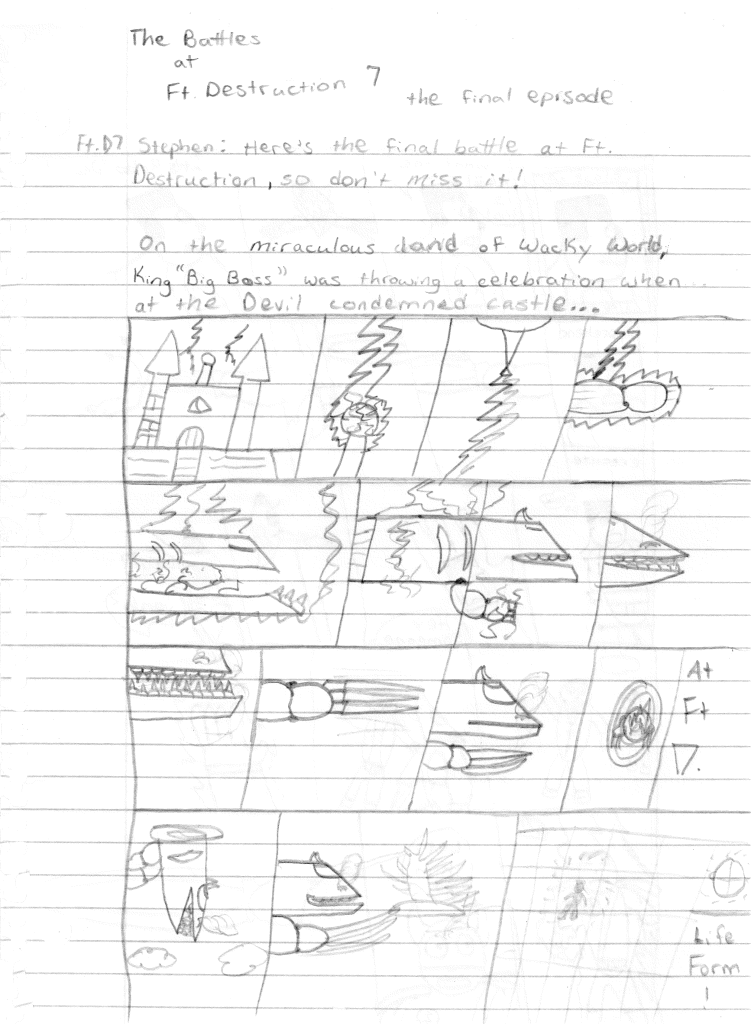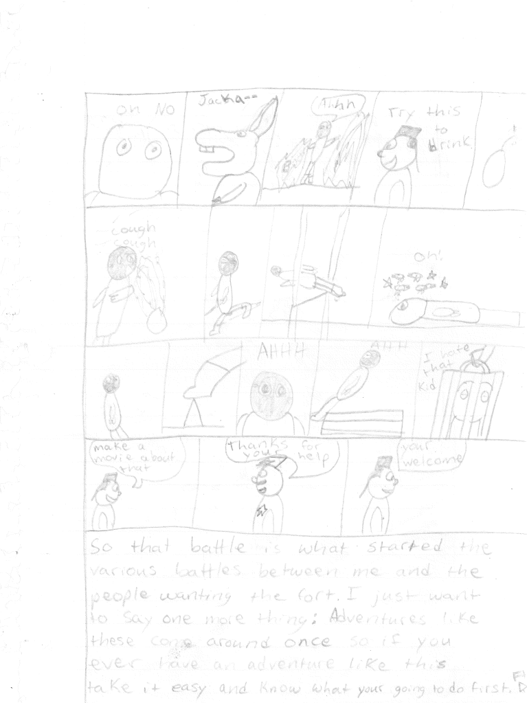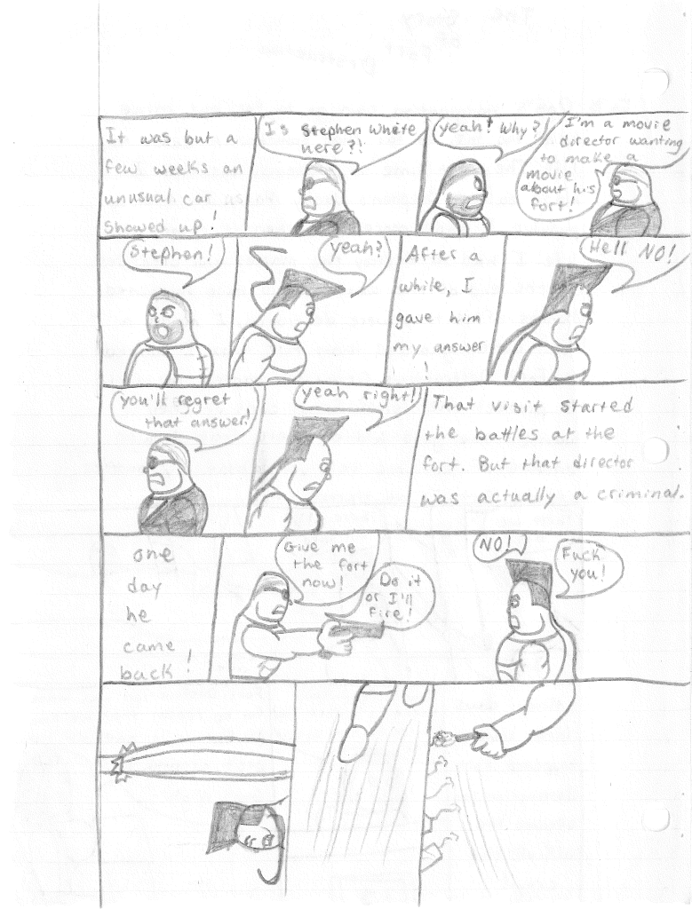 After building Fort Destruction, Stephen considers that “mabye” he’ll get famous by telling people about it. I’m not necessarily following the logic here. Soon after, a man comes looking for Stephen wanting to make a movie about the fort, because that’s what happens . After Stephen tells them “no,” he shows his hand by saying, “you’ll regret this.” I’m not sure how this plan was suppose to work. In any case, the guy returns “as a criminal” and just opens fire on Stephen. Luckily, Stephen has this fort to fight back with fireworks or whatever. After some lame jokes and Looney Tunes-esque hijinks, the guy is caught and handed over to the authorities, never to be seen again. The story concluded with what I can only assume was meant to be a poignant ending, as I tried to lay down some sage advice for anyone ever caught up in a situation like this. Because they happen often. The advice is ludicrous, but I get what I was trying to do here.