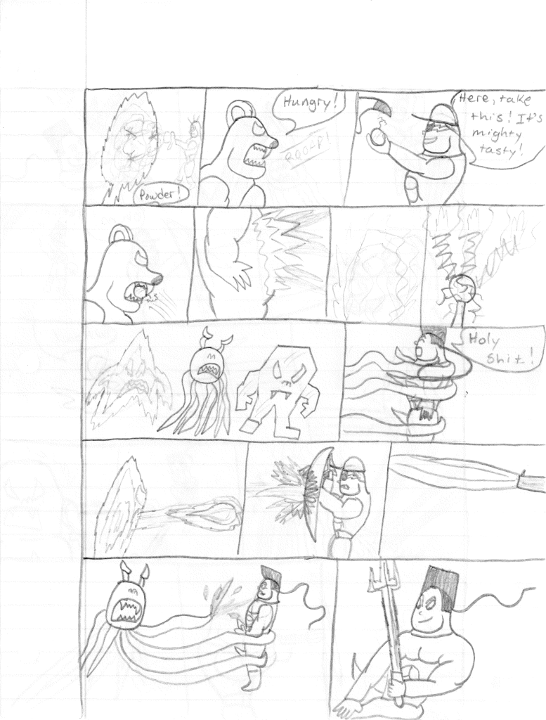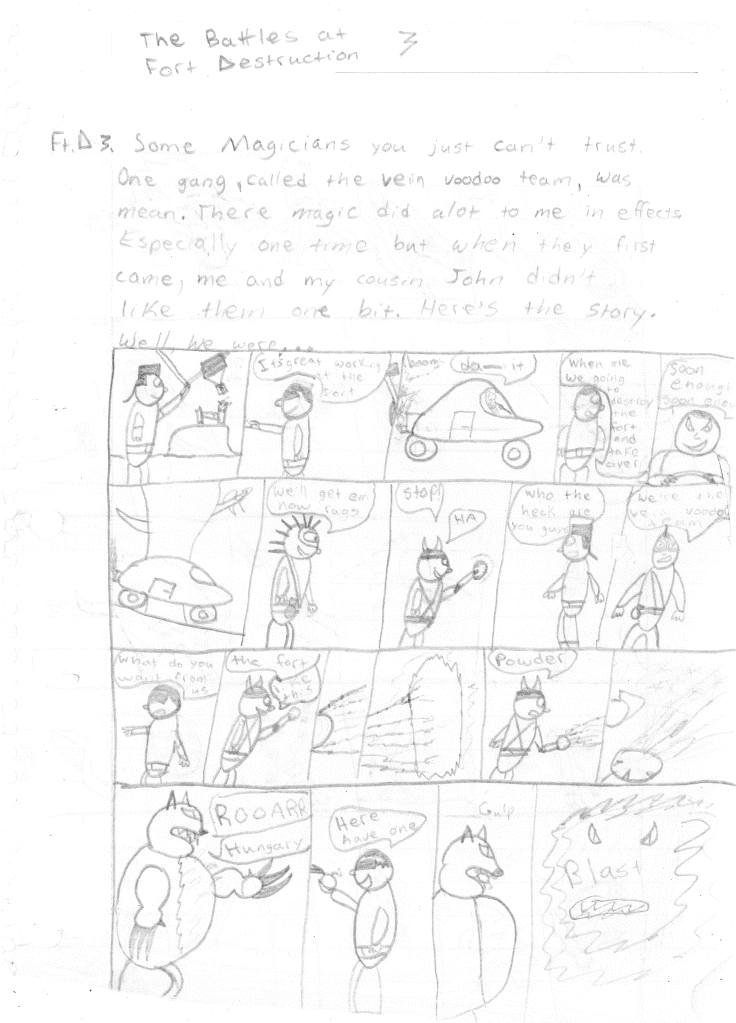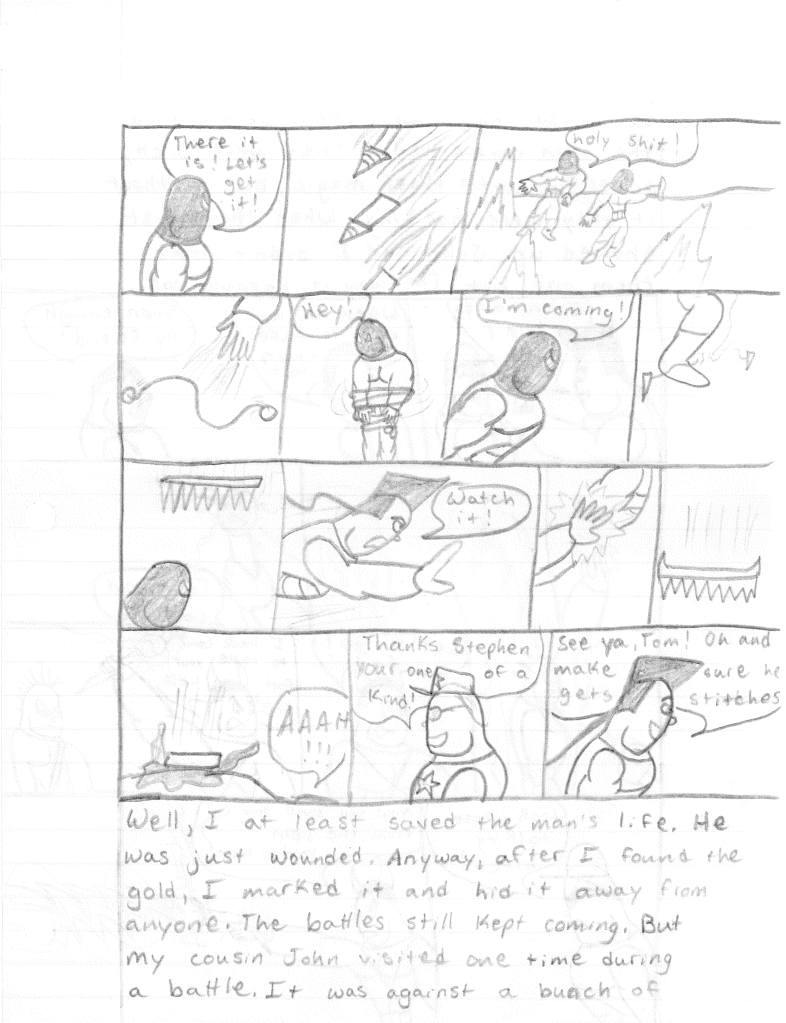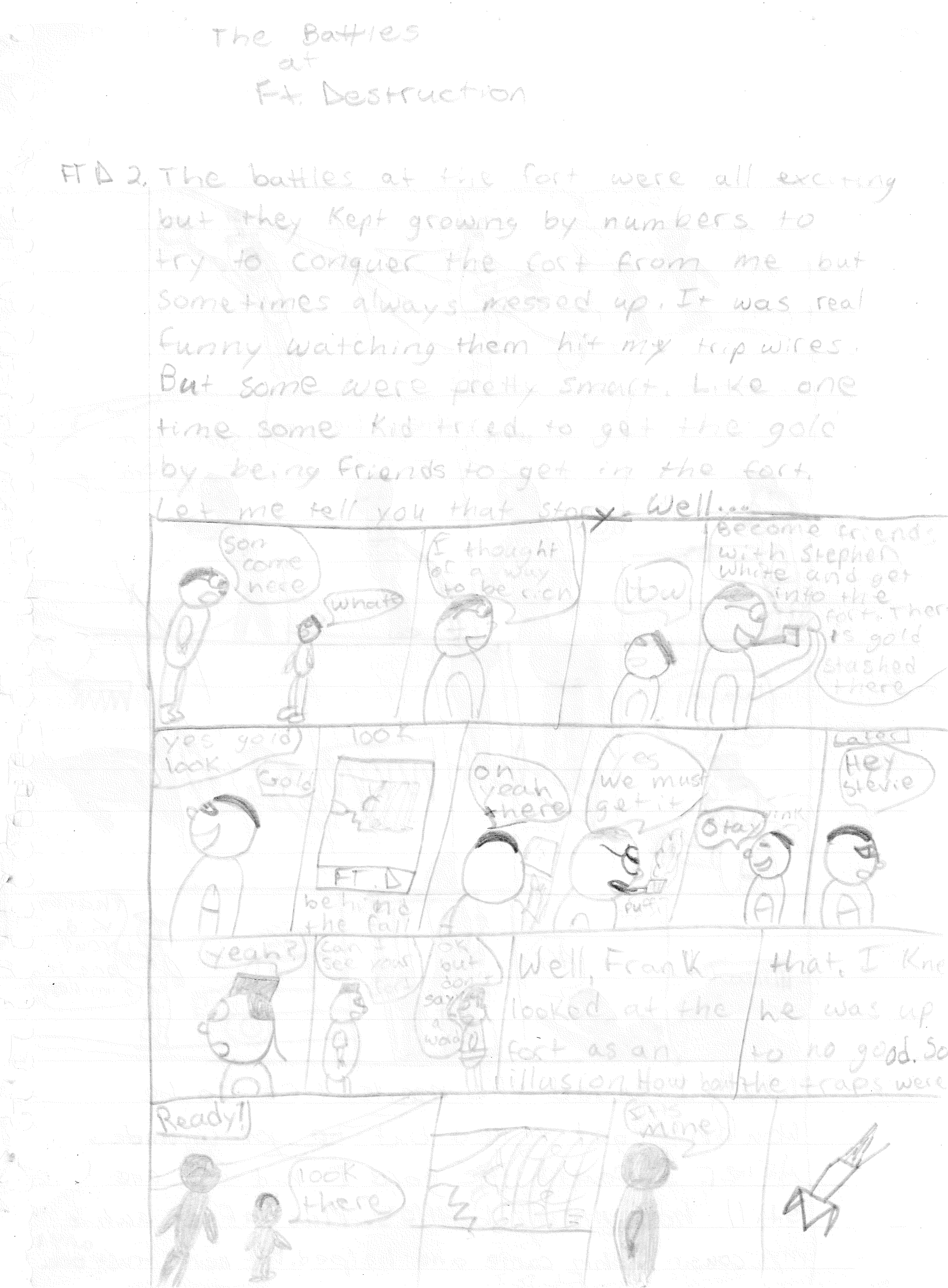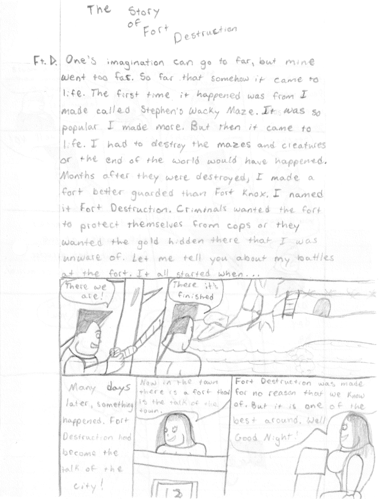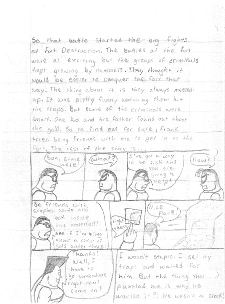 After building Fort Destruction, Stephen considers that “mabye” he’ll get famous by telling people about it. I’m not necessarily following the logic here. Soon after, a man comes looking for Stephen wanting to make a movie about the fort, because that’s what happens . After Stephen tells them “no,” he shows his hand by saying, “you’ll regret this.” I’m not sure how this plan was suppose to work. In any case, the guy returns “as a criminal” and just opens fire on Stephen. Luckily, Stephen has this fort to fight back with fireworks or whatever. After some lame jokes and Looney Tunes-esque hijinks, the guy is caught and handed over to the authorities, never to be seen again. The story concluded with what I can only assume was meant to be a poignant ending, as I tried to lay down some sage advice for anyone ever caught up in a situation like this. Because they happen often. The advice is ludicrous, but I get what I was trying to do here.