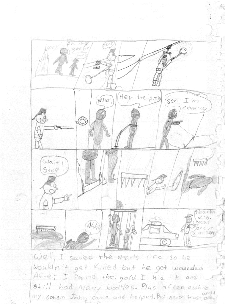 As soon as the father/son combo appears, Stephen immediately opens fire and ropes up the kid. In the next panel, as the father goes to help his kid, we see he sets off a particularly dangerous trap. Stephen rushes to push him to safety but only manages to keep him from death. He’s still injured. Now looking at that trap, if you weren’t planning on killing someone with that, what were your intentions? It’s weird as is the ending with the duo locked in a cage, ready for the police. Despite not being explicitly told why they were there, Stephen seemingly found the gold and hid it, but still had many battles. And even his cousin John came to help. But the moral here is not to trust anyone. Who knew I was that cynical at twelve?