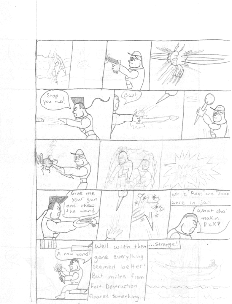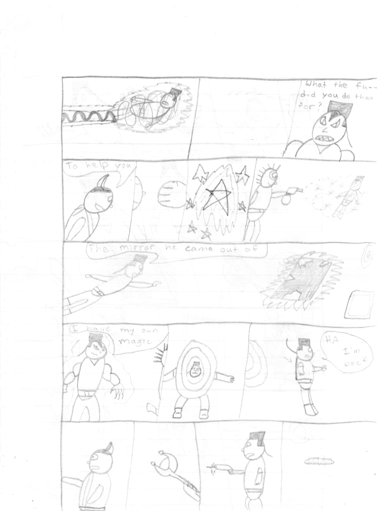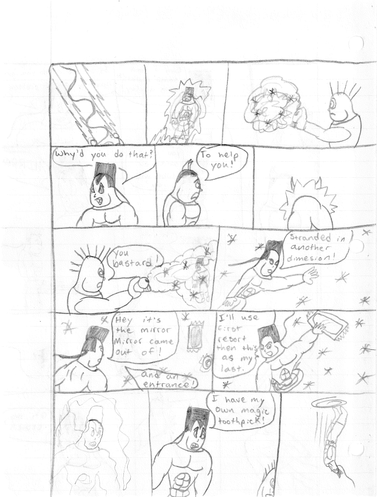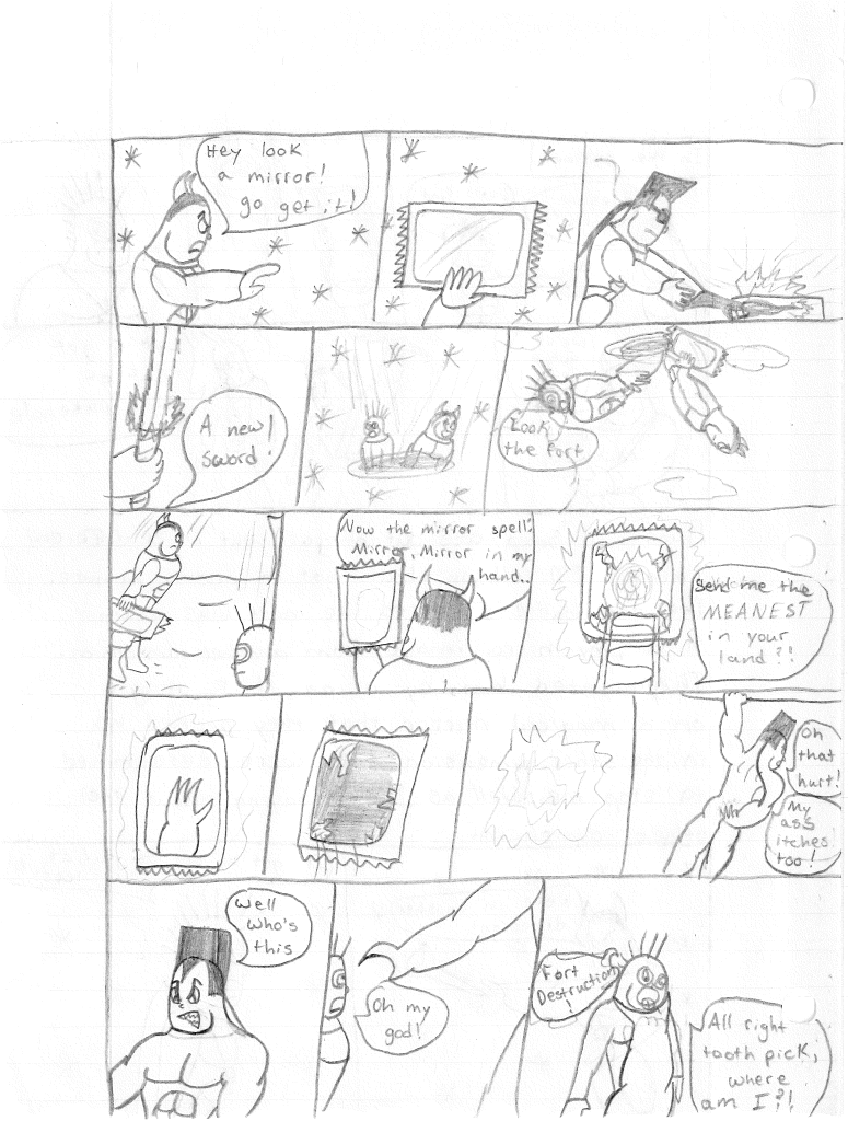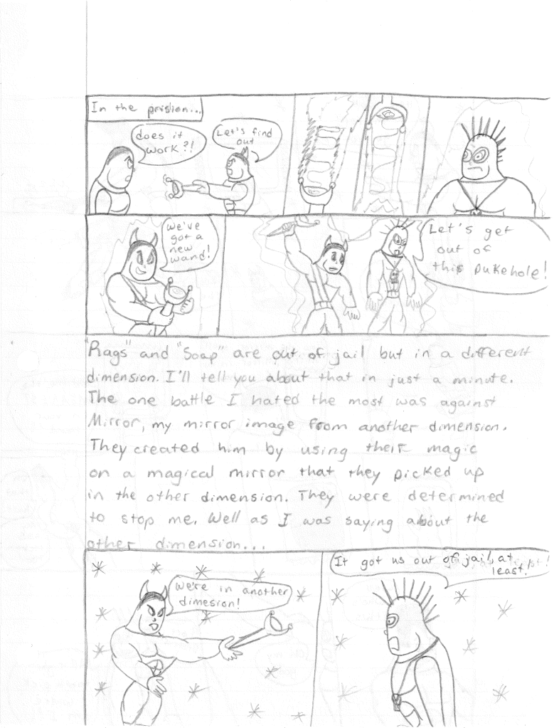 Mirror finds Stephen’s old sword and immediately attacks Stephen, with both getting some good licks in. Rags uses his wand on Stephen to assist, but all that does is anger Mirror. Meanwhile, Stephen finds the magic mirror in the space between dimensions, which is confusing because it was near the fort when they used it to summon Mirror… so how did it… you know what? Doesn’t matter. Stephen somehow escapes the space between dimensions then attempts to use the magic mirror on Mirror but to no avail. But then, Stephen produces a small mirror and points it directly at Mirror which causes him to be sucked back into the magic mirror. “How?” you may be asking. Doesn’t matter. Stephen then uses Rags’ wand against him and Soap, sending them to an alternate dimension. TO BE CONTINUED…