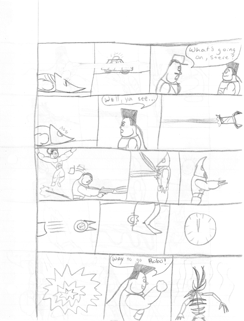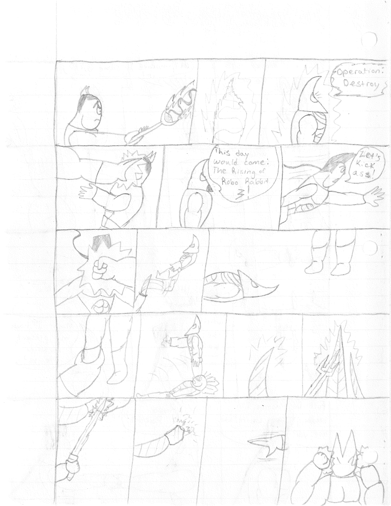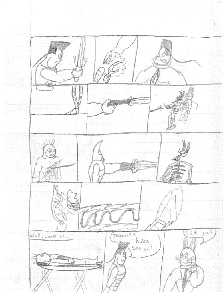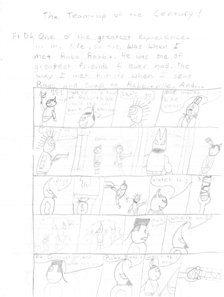 The events of the last story led to the Team-Up of the Century, which was my first crossover event. I was so excited about the prospect that I wanted to make it huge. It would not only be episode six of The Battle of Fort Destruction, but also episode 8 of The Adventures of Robo-Rabbit. Each episode matches almost panel to panel with certain variations to reflect the story more to one side. Looking back on it now, such an event should have been two-parter split between each series. Still, it’s an impressive feat for a twelve-year-old.
