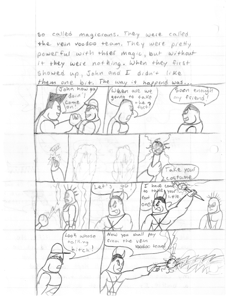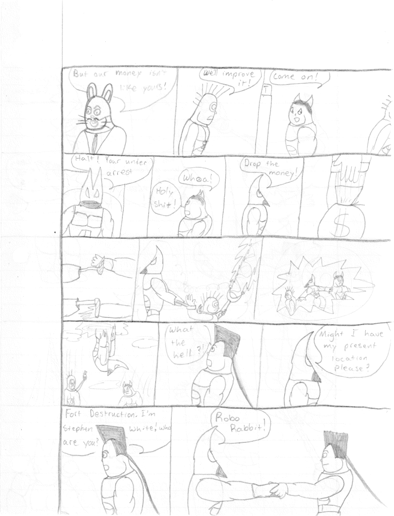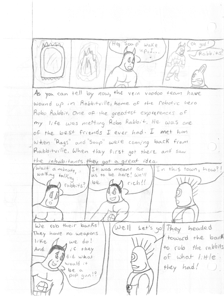 I really wanted people to know that THIS was a big event, even though no one ever read my comics. I guess all of these were really blueprints for my ideas. In any case, I was excited about this one. The story picks up with Rags and Soap in Rabbitville, eager to start a crime spree. Mainly because Rags assumes rabbits are weak. But what they didn’t count on is that rabbit money is not like human money. Despite that, Robo-Rabbit arrives to stop them, but Rags turns the tables on him and teleports them all back to Fort Destruction. Upon arriving, introductions between Stephen and Robo-Rabbit are instantaneous, as is the creation of Robo-Rabbit 3 which Robo-Rabbit creates a rhyme about. I didn’t realize it at the time, but the Vein Voodoo Team was responsible for two second doppelganger villains. They don’t seem very original…or maybe I don’t.